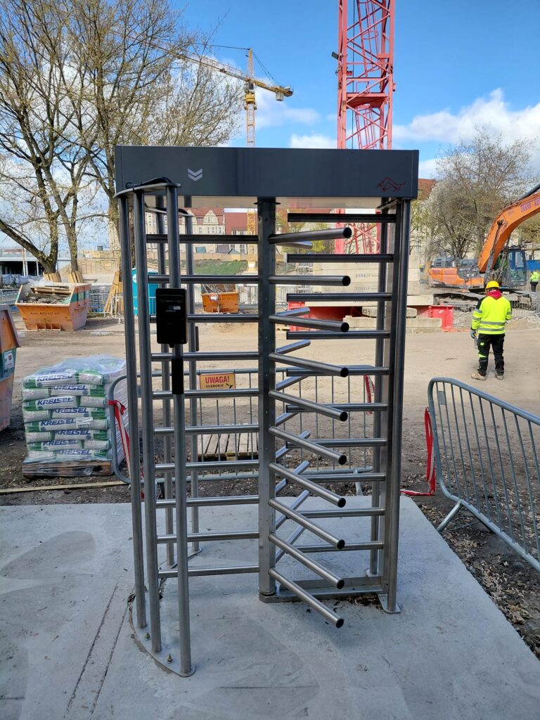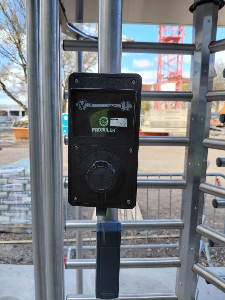 Realizacja obejmowała kompleksowy montaż systemu kontroli dostępu zintegrowanego z alkomatami, przeznaczonego do weryfikacji pracowników przed wejściem na teren budowy. Zastosowano bramki obrotowe dostarczone przez firmę Wano, które zostały połączone z systemem identyfikacji oraz kontrolą trzeźwości.